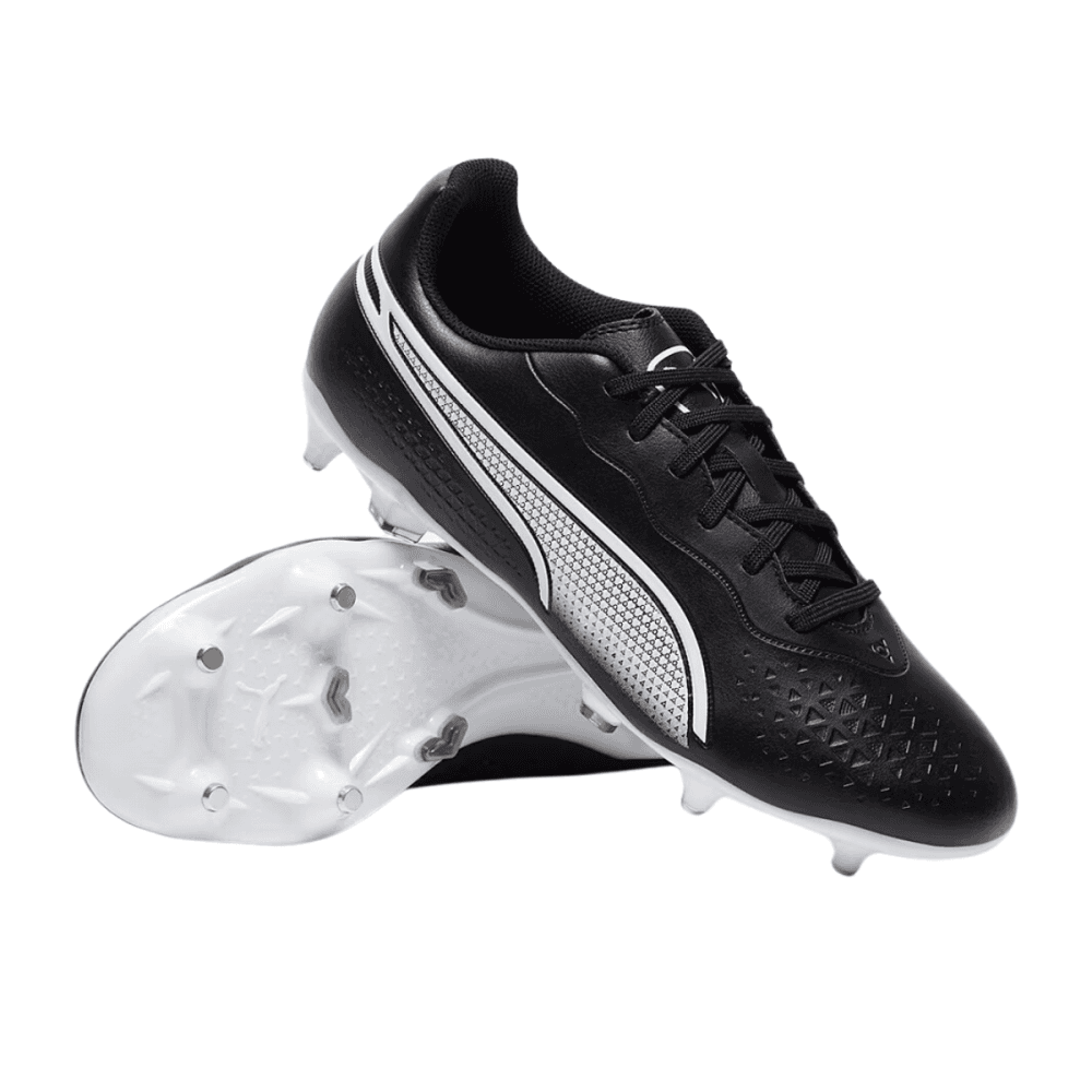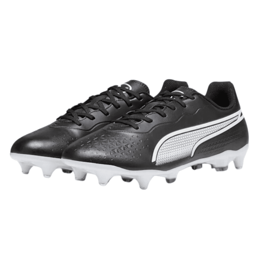 *Excludes large items & TeamwearTake to the pitch and control the game with these men's King Match FG football boots from PUMA. In a Black and White colourway, these boots are cut from smooth textile and synthetic microfibre in the upper, including at least 20% recycled content. They feature a lace fastening to lock you in, with a padded collar for added support. Underfoot, they sit on a TPU outsole with conical studs for traction on firm ground. Finished up with the signature Formstrip and signature PUMA branding.